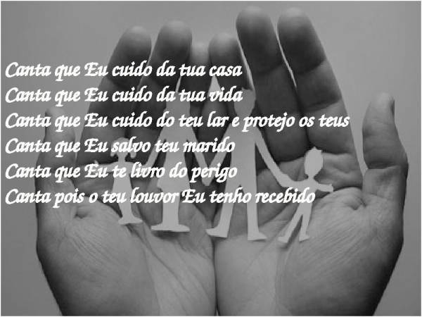 - Canta que Eu cuido da tua casaCanta que Eu cuido da tua vidaCanta que Eu cuido do teu lar e protejo os teus Canta que Eu salvo teu marido Canta que Eu te livro do perigo Canta pois o teu louvor Eu tenho recebido