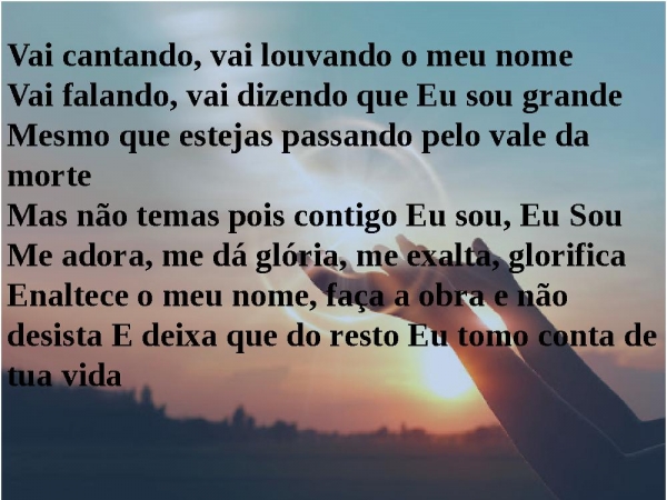 - Vai cantando, vai louvando o meu nome Vai falando, vai dizendo que Eu sou grande Mesmo que estejas passando pelo vale da morte Mas não temas pois contigo Eu sou, Eu Sou Me adora, me dá glória, me exalta, glorifica Enaltece o meu nome, faça a obra e não desista E deixa que do resto Eu tomo conta de tua vida
