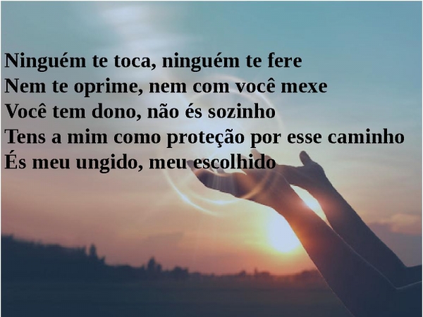- Ninguém te toca, ninguém te fere Nem te oprime, nem com você mexe Você tem dono, não és sozinho Tens a mim como proteção por esse caminho És meu ungido, meu escolhido