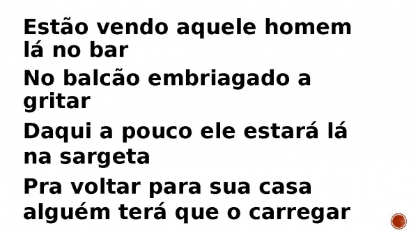 - Estão vendo aquele homem lá no bar No balcão embriagado a gritar Daqui a pouco ele estará lá na sargetaPra voltar para sua casa alguém terá que o carregar