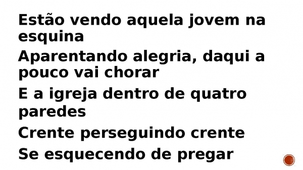 - Estão vendo aquela jovem na esquina Aparentando alegria, daqui a pouco vai chorar E a igreja dentro de quatro paredes Crente perseguindo crenteSe esquecendo de pregar