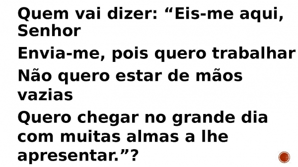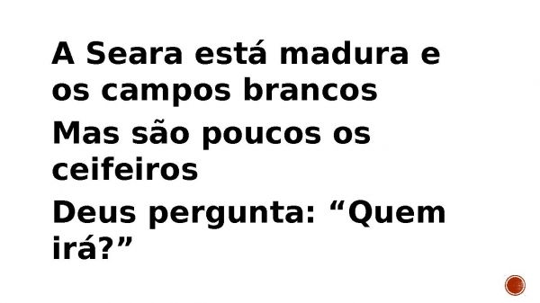 - A Seara está madura e os campos brancos Mas são poucos os ceifeiros Deus pergunta: “Quem irá?”