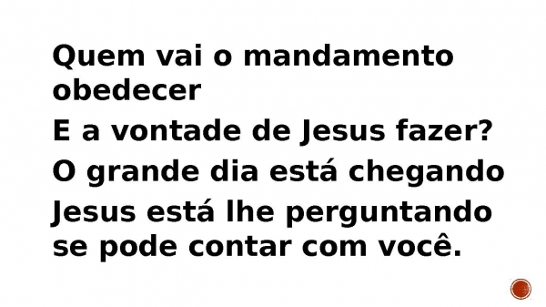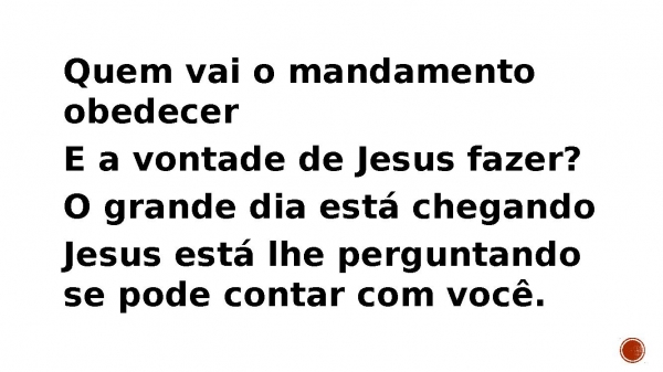 - Quem vai o mandamento obedecer E a vontade de Jesus fazer?O grande dia está chegandoJesus está lhe perguntando se pode contar com você.