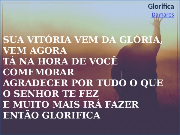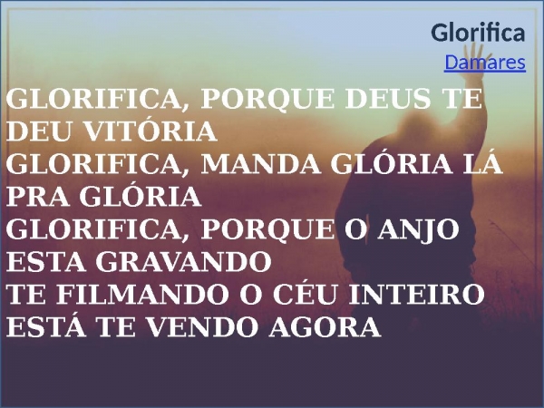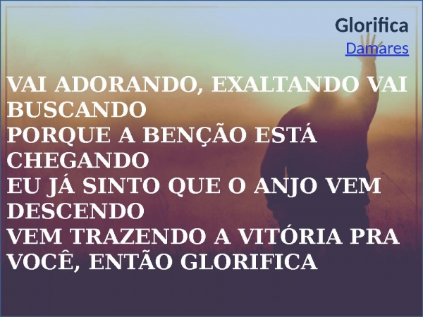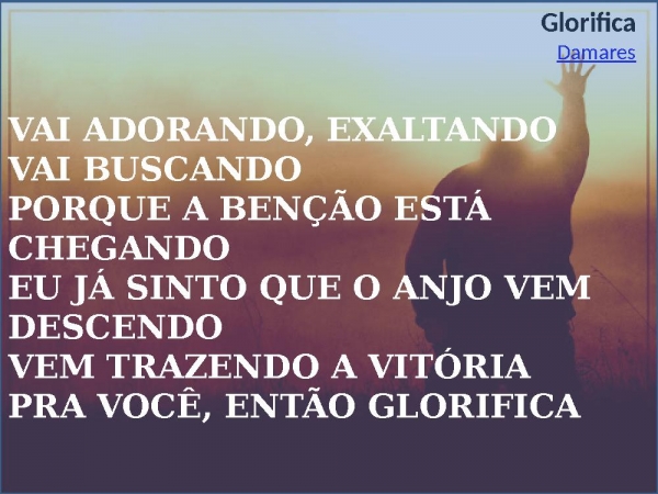 - GlorificaDamaresVAI ADORANDO, EXALTANDO VAI BUSCANDOPORQUE A BENÇÃO ESTÁ CHEGANDOEU JÁ SINTO QUE O ANJO VEM DESCENDOVEM TRAZENDO A VITÓRIA PRA VOCÊ, ENTÃO GLORIFICA