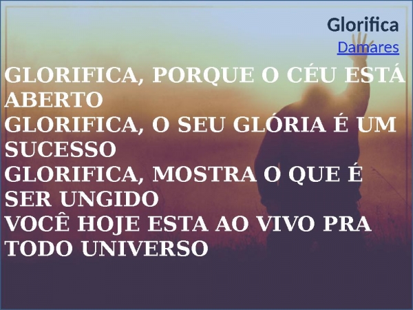 - GlorificaDamaresGLORIFICA, PORQUE O CÉU ESTÁ ABERTOGLORIFICA, O SEU GLÓRIA É UM SUCESSOGLORIFICA, MOSTRA O QUE É SER UNGIDOVOCÊ HOJE ESTA AO VIVO PRA TODO UNIVERSO