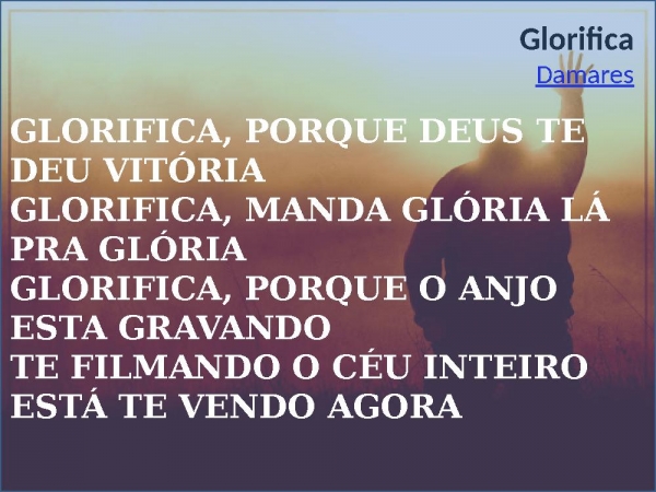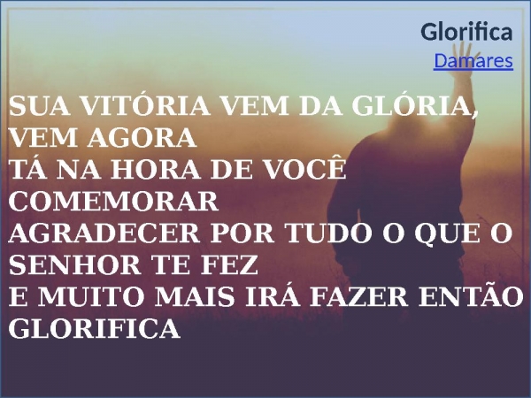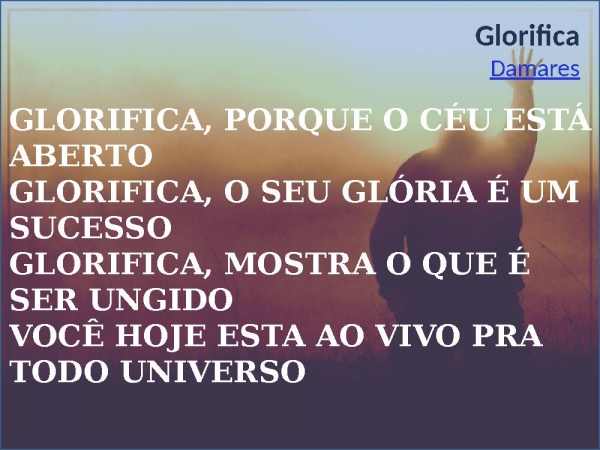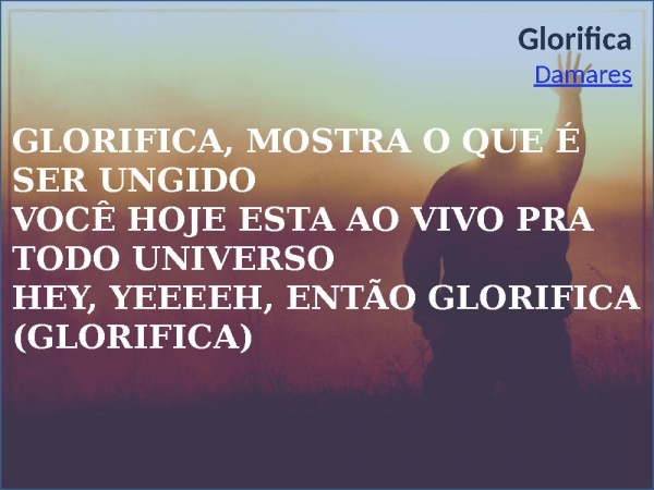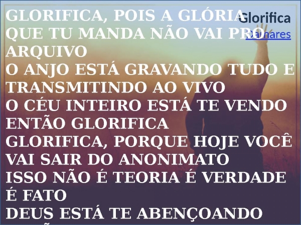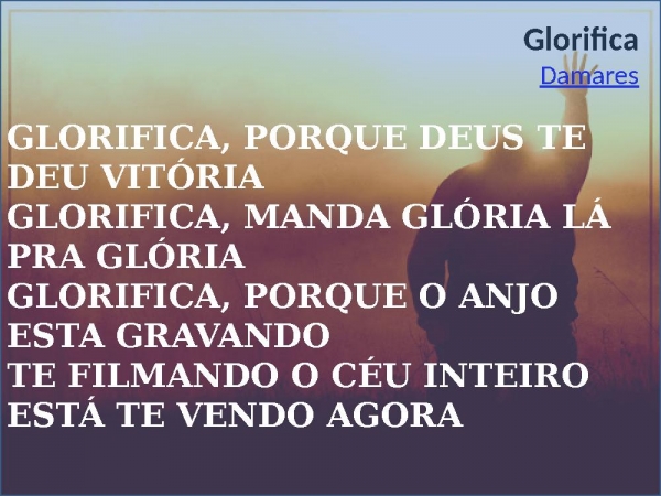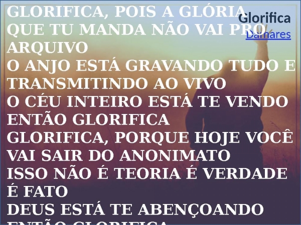 - GlorificaDamaresGLORIFICA, POIS A GLÓRIA QUE TU MANDA NÃO VAI PRO ARQUIVOO ANJO ESTÁ GRAVANDO TUDO E TRANSMITINDO AO VIVOO CÉU INTEIRO ESTÁ TE VENDO ENTÃO GLORIFICAGLORIFICA, PORQUE HOJE VOCÊ VAI SAIR DO ANONIMATOISSO NÃO É TEORIA É VERDADE É FATODEUS ESTÁ TE ABENÇOANDO ENTÃO GLORIFICA