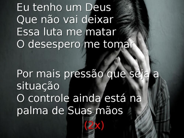 - Eu tenho um DeusQue não vai deixarEssa luta me matarO desespero me tomarPor mais pressão que seja a situaçãoO controle ainda está na palma de Suas mãos(2x)