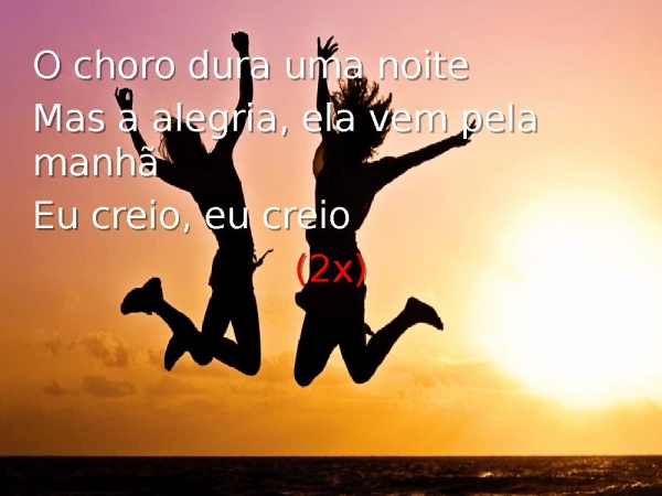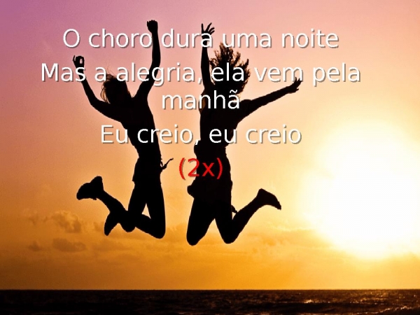 - O choro dura uma noiteMas a alegria, ela vem pela manhãEu creio, eu creio(2x)