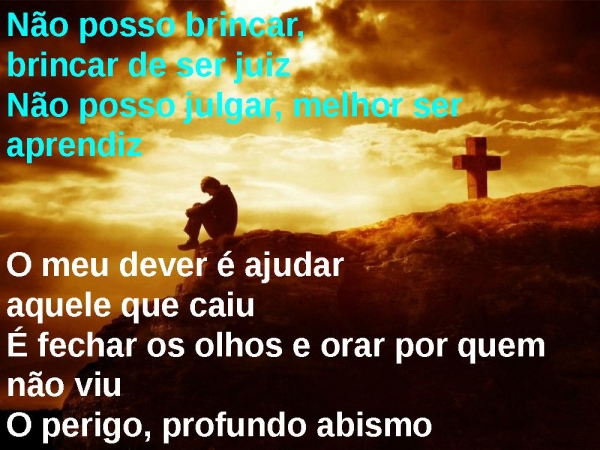 - Não posso brincar, brincar de ser juizNão posso julgar, melhor ser aprendizO meu dever é ajudar aquele que caiuÉ fechar os olhos e orar por quem não viuO perigo, profundo abismo