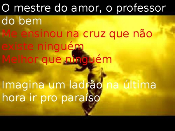 - O mestre do amor, o professor do bemMe ensinou na cruz que não existe ninguémMelhor que ninguémImagina um ladrão na última hora ir pro paraíso