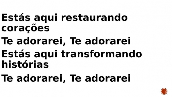 - Estás aqui restaurando corações Te adorarei, Te adorarei Estás aqui transformando histórias Te adorarei, Te adorarei