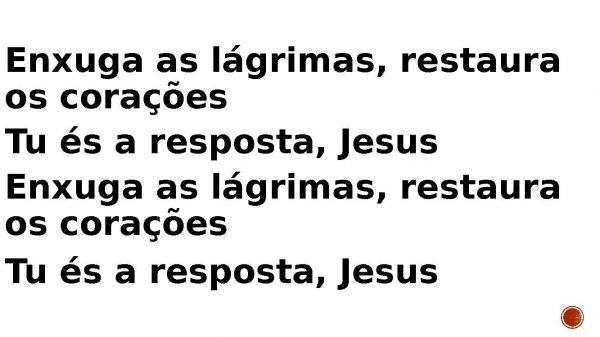 - Enxuga as lágrimas, restaura os corações Tu és a resposta, Jesus Enxuga as lágrimas, restaura os corações Tu és a resposta, Jesus