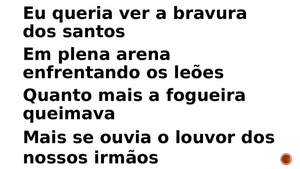 - Eu queria ver a bravura dos santos Em plena arena enfrentando os leões Quanto mais a fogueira queimava Mais se ouvia o louvor dos nossos irmãos