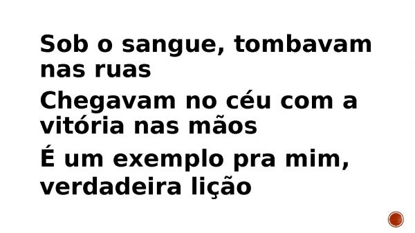 - Sob o sangue, tombavam nas ruas Chegavam no céu com a vitória nas mãos É um exemplo pra mim, verdadeira lição