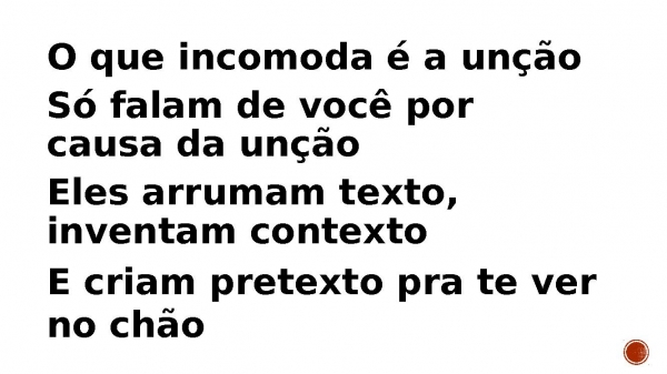 - O que incomoda é a unção Só falam de você por causa da unção Eles arrumam texto, inventam contexto E criam pretexto pra te ver no chão