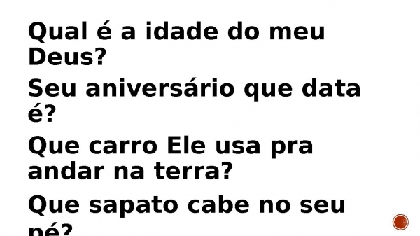 - Qual é a idade do meu Deus? Seu aniversário que data é? Que carro Ele usa pra andar na terra? Que sapato cabe no seu pé?