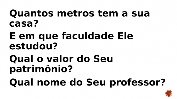 - Quantos metros tem a sua casa? E em que faculdade Ele estudou? Qual o valor do Seu patrimônio? Qual nome do Seu professor?