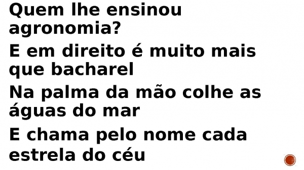- Quem lhe ensinou agronomia? E em direito é muito mais que bacharel Na palma da mão colhe as águas do mar E chama pelo nome cada estrela do céu