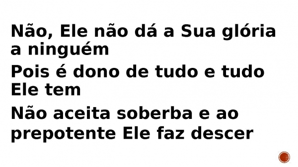 - Não, Ele não dá a Sua glória a ninguém Pois é dono de tudo e tudo Ele tem Não aceita soberba e ao prepotente Ele faz descer