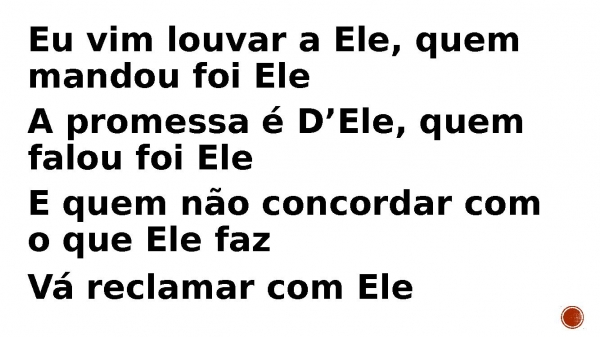 - Eu vim louvar a Ele, quem mandou foi Ele A promessa é D’Ele, quem falou foi Ele E quem não concordar com o que Ele faz Vá reclamar com Ele