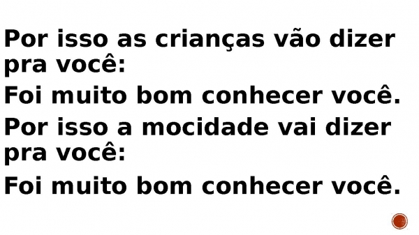 - Por isso as crianças vão dizer pra você: Foi muito bom conhecer você. Por isso a mocidade vai dizer pra você: Foi muito bom conhecer você.