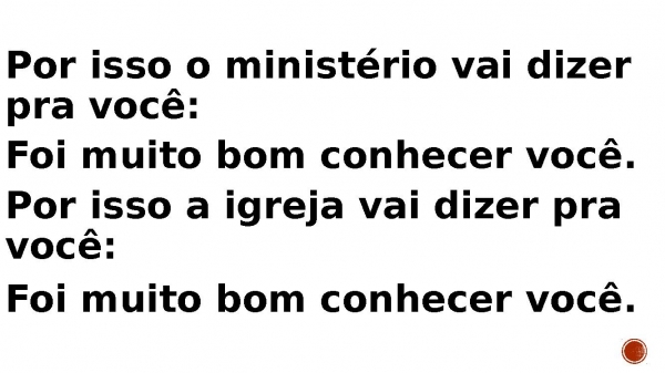- Por isso o ministério vai dizer pra você: Foi muito bom conhecer você. Por isso a igreja vai dizer pra você: Foi muito bom conhecer você.