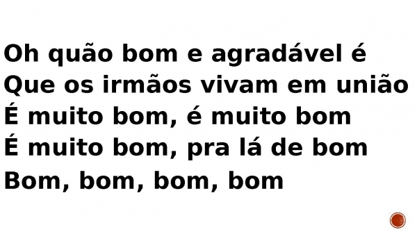 - Oh quão bom e agradável é Que os irmãos vivam em união É muito bom, é muito bom É muito bom, pra lá de bom Bom, bom, bom, bom