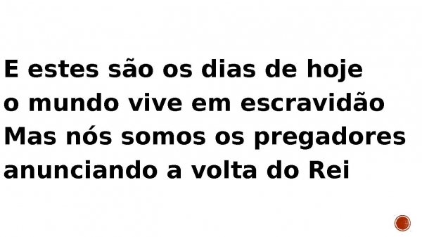 - E estes são os dias de hojeo mundo vive em escravidão Mas nós somos os pregadoresanunciando a volta do Rei