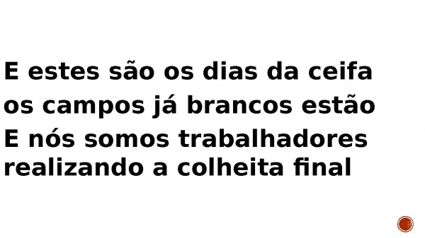 - E estes são os dias da ceifaos campos já brancos estão E nós somos trabalhadores realizando a colheita final