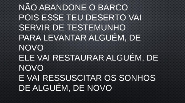 - Não abandone o barcoPois esse teu deserto vai servir de testemunhoPara levantar alguém, de novoEle vai restaurar alguém, de novoE vai ressuscitar os sonhos de alguém, de novo