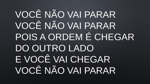 - Você não vai pararVocê não vai pararPois a ordem é chegar do outro ladoE você vai chegarVocê não vai parar