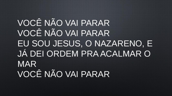 - Você não vai pararVocê não vai pararEu sou Jesus, o Nazareno, e já dei ordem pra acalmar o marVocê não vai parar