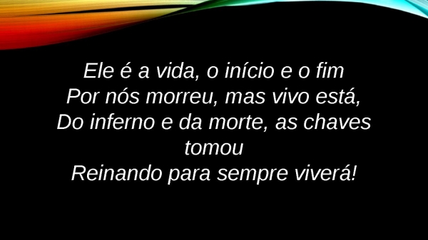 - Ele é a vida, o início e o fimPor nós morreu, mas vivo está,Do inferno e da morte, as chaves tomouReinando para sempre viverá!