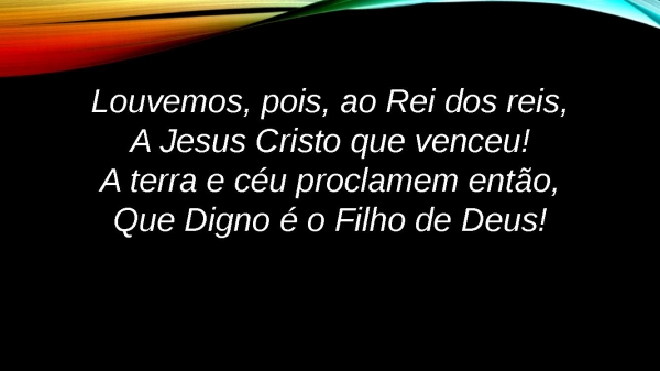 - Louvemos, pois, ao Rei dos reis,A Jesus Cristo que venceu!A terra e céu proclamem então,Que Digno é o Filho de Deus!