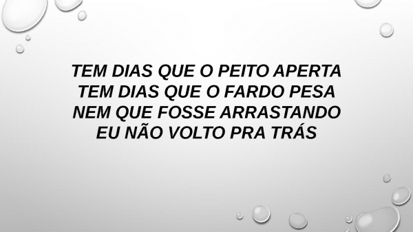 - Tem dias que o peito apertaTem dias que o fardo pesaNem que fosse arrastandoEu não volto pra trás