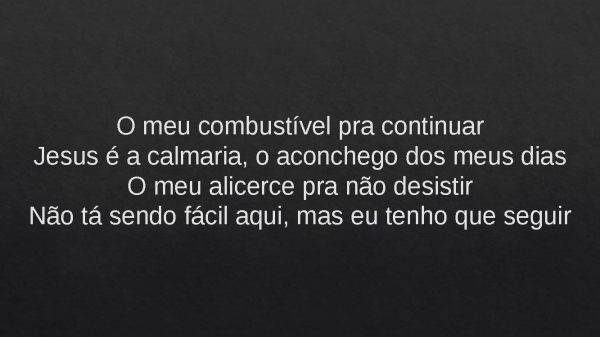 - O meu combustível pra continuarJesus é a calmaria, o aconchego dos meus diasO meu alicerce pra não desistirNão tá sendo fácil aqui, mas eu tenho que seguir