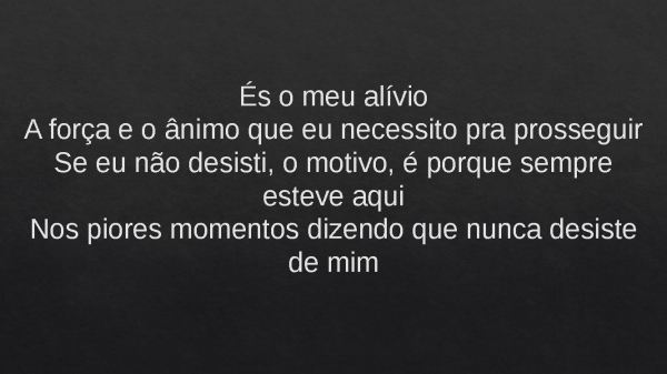 - És o meu alívioA força e o ânimo que eu necessito pra prosseguirSe eu não desisti, o motivo, é porque sempre esteve aquiNos piores momentos dizendo que nunca desiste de mim