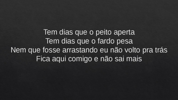 - Tem dias que o peito apertaTem dias que o fardo pesaNem que fosse arrastando eu não volto pra trásFica aqui comigo e não sai mais
