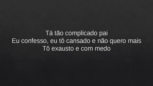 - Tá tão complicado paiEu confesso, eu tô cansado e não quero maisTô exausto e com medo