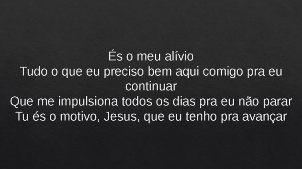 - És o meu alívioTudo o que eu preciso bem aqui comigo pra eu continuarQue me impulsiona todos os dias pra eu não pararTu és o motivo, Jesus, que eu tenho pra avançar
