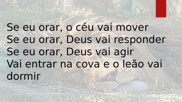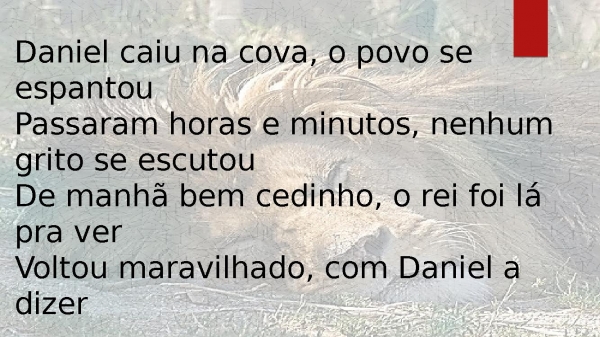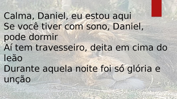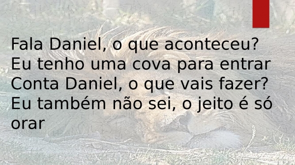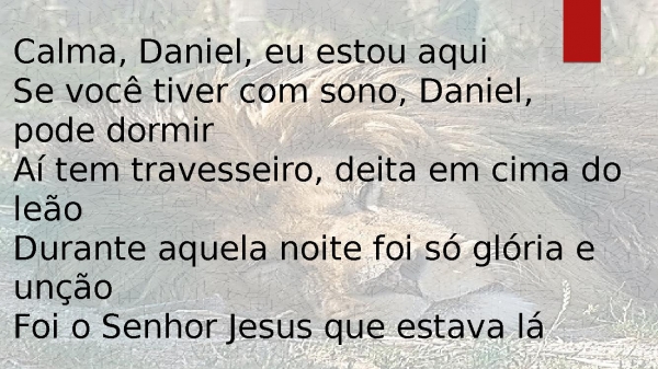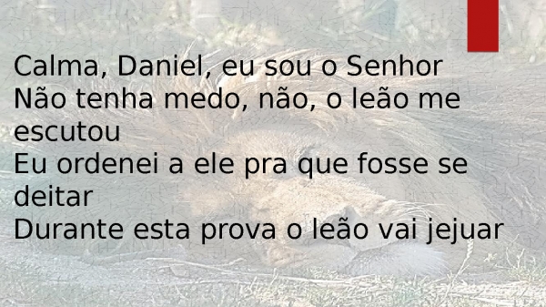 - Calma, Daniel, eu sou o SenhorNão tenha medo, não, o leão me escutouEu ordenei a ele pra que fosse se deitarDurante esta prova o leão vai jejuar