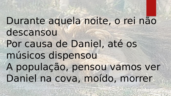 - Durante aquela noite, o rei não descansouPor causa de Daniel, até os músicos dispensouA população, pensou vamos verDaniel na cova, moído, morrer