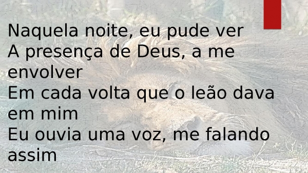 - Naquela noite, eu pude verA presença de Deus, a me envolverEm cada volta que o leão dava em mimEu ouvia uma voz, me falando assim