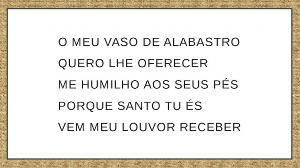 - O meu vaso de alabastroQuero lhe oferecerMe humilho aos seus pésPorque santo tu ésVem meu louvor receber