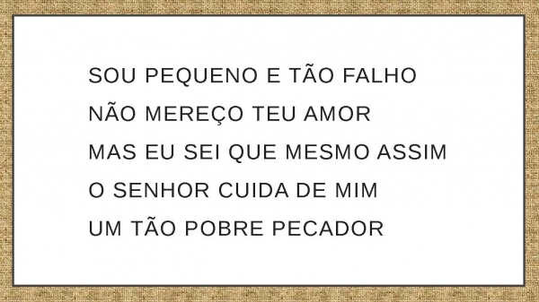- Sou pequeno e tão falhoNão mereço teu amorMas eu sei que mesmo assimO Senhor cuida de mimUm tão pobre pecador