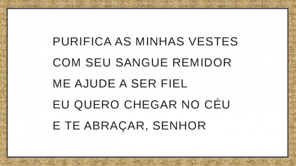 - Purifica as minhas vestes Com seu sangue remidor Me ajude a ser fielEu quero chegar no céuE te abraçar, Senhor