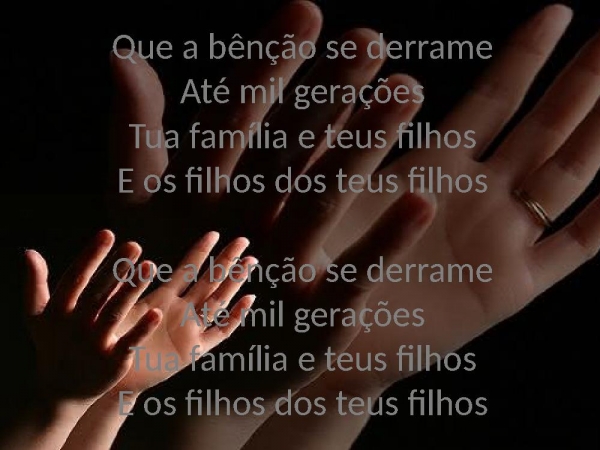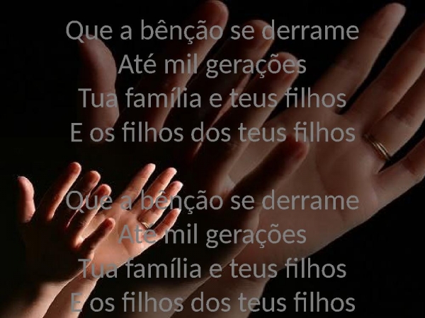 - Que a bênção se derrameAté mil geraçõesTua família e teus filhosE os filhos dos teus filhosQue a bênção se derrameAté mil geraçõesTua família e teus filhosE os filhos dos teus filhos
