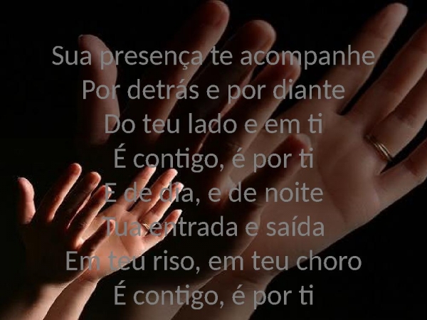 - Sua presença te acompanhePor detrás e por dianteDo teu lado e em tiÉ contigo, é por tiE de dia, e de noiteTua entrada e saídaEm teu riso, em teu choroÉ contigo, é por ti