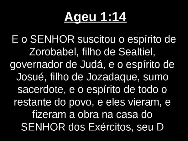 - Ageu 1:14 E o SENHOR suscitou o espírito de Zorobabel, filho de Sealtiel, governador de Judá, e o espírito de Josué, filho de Jozadaque, sumo sacerdote, e o espírito de todo o restante do povo, e eles vieram, e fizeram a obra na casa do SENHOR dos Exércitos, seu D