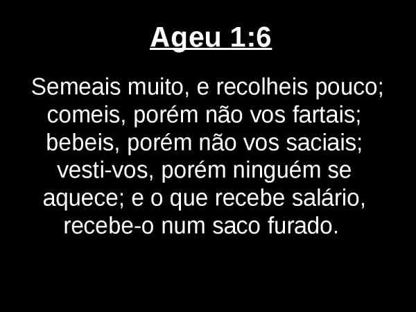- Ageu 1:6 Semeais muito, e recolheis pouco; comeis, porém não vos fartais; bebeis, porém não vos saciais; vesti-vos, porém ninguém se aquece; e o que recebe salário, recebe-o num saco furado.